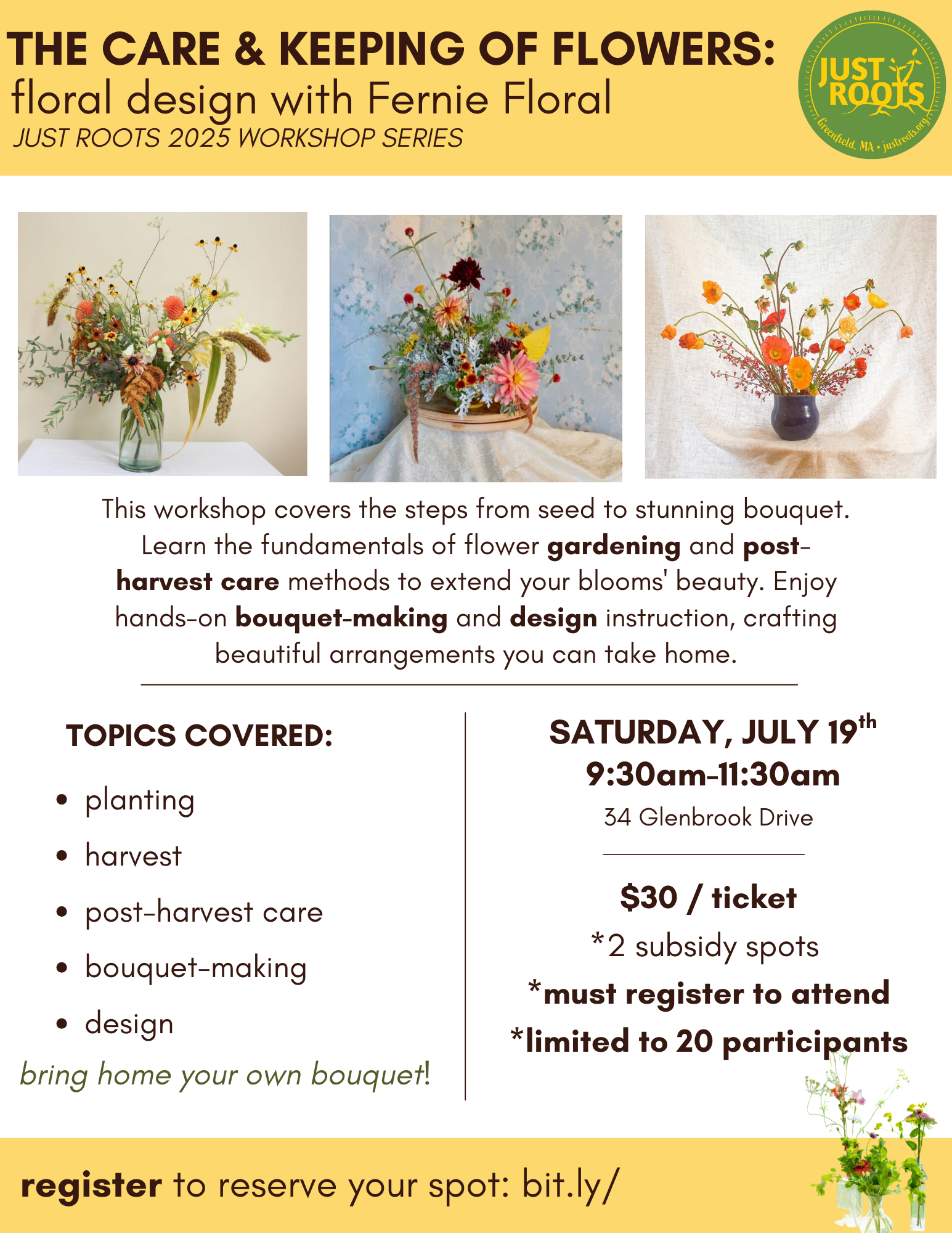 This workshop covers the fundamentals of flower harvest and floral design. Learn best practices of flower harvesting and post-harvest care methods to extend your blooms' beauty. Enjoy hands on bouquet-making and design instruction, crafting beautiful arrangements to take home.